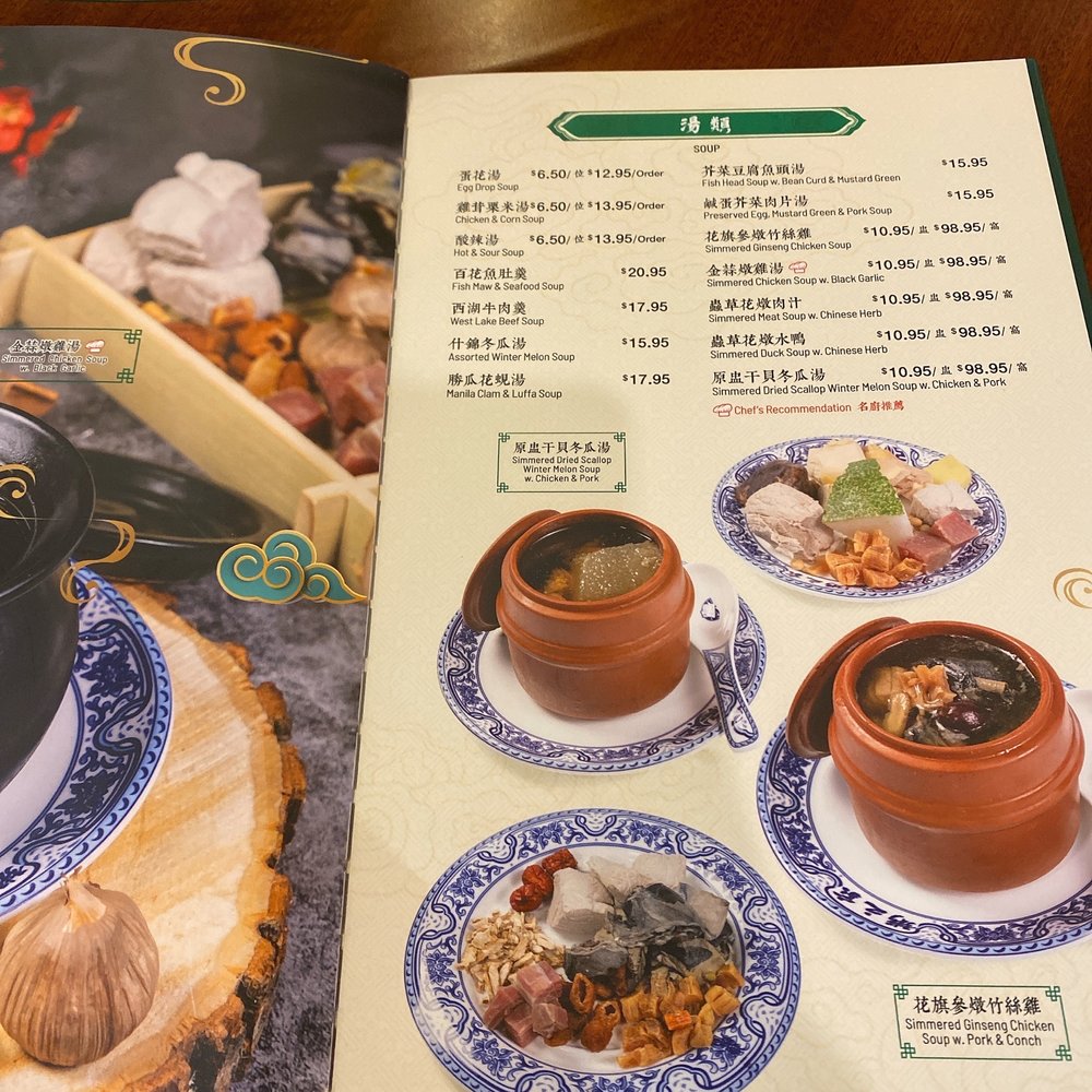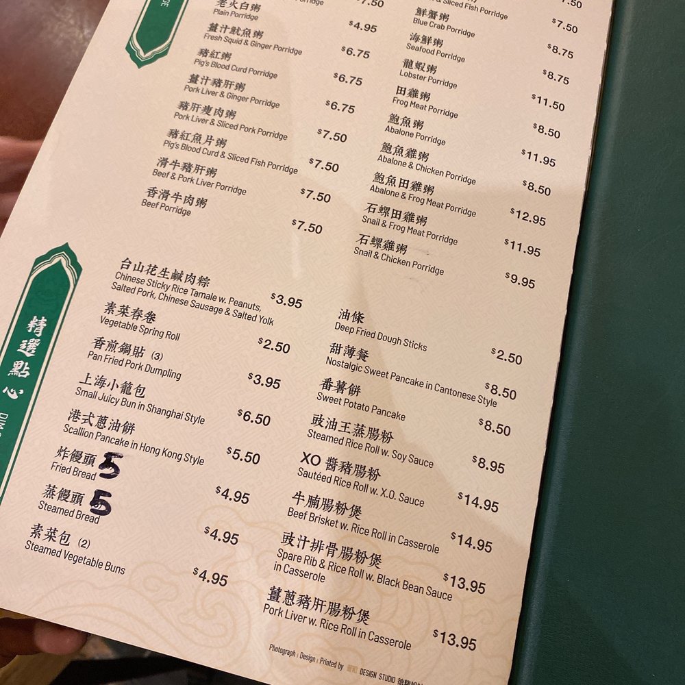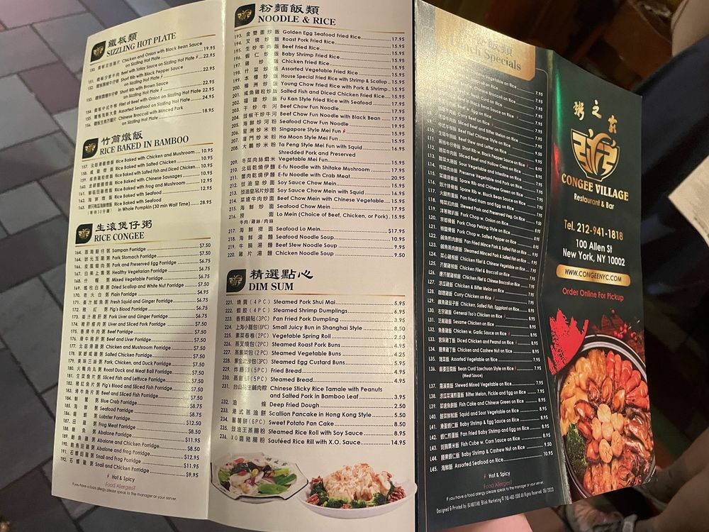 Introducing the menu at Congee Village, a Cantonese restaurant in Manhattan, known for its traditional dishes and spacious dining area. The menu boasts popular dishes like Golden Egg Seafood Fried Rice, Beef Chow Fun Noodle, and House Special Seafood in Casserole. Appetizers and dim sum options include Chinese Sticky Rice Tamale, Shanghai Soup Dumplings, and Scallion Pancake. For congee lovers, there is a variety of options like Pork Stomach Porridge and Healthy Vegetarian Congee.